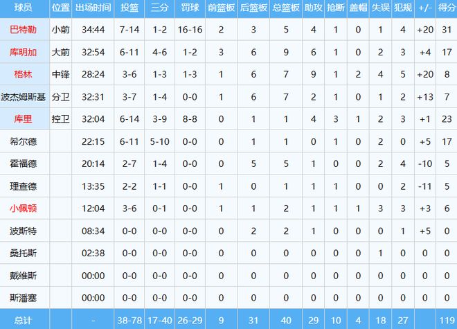 勇士四人得分上双,巴特勒16罚全中轰下31分外加5板4助,库里23分4助,库明加17分9板6助,希尔德17分。